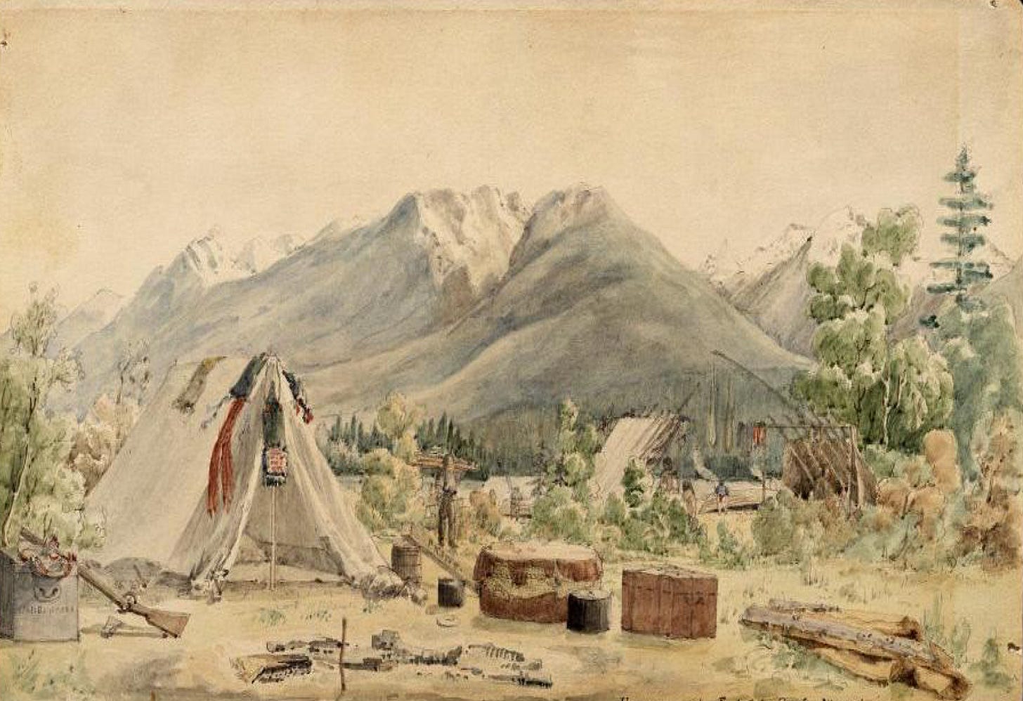 Kane's exposure to Catlin’s work and ideas about Indians as a "vanishing race" grew into an ambitious project of his own; to travel amongst the First Nations of Canada’s western territories, as Catlin had done south of the border. Like the Group of Seven more than sixty years later, Kane began by exploring the wild margins of the Great Lakes in 1845. With support from the Hudson’s Bay Company the following year, he traveled from Toronto to Fort Vancouver, located in present-day Washington State. The Oregon Treaty of 1846 established the boundary between Canada and the U.S. along the 49th parallel north of the equator. Kane was present during the transition period that spanned several years. In 1848, he returned to Toronto. An exhibition of his works was met with great acclaim. Apart from a stint as an expeditionary artist in 1849, Kane spent the remainder of his life in Toronto; raising a family and elaborating his fieldwork into finished paintings
