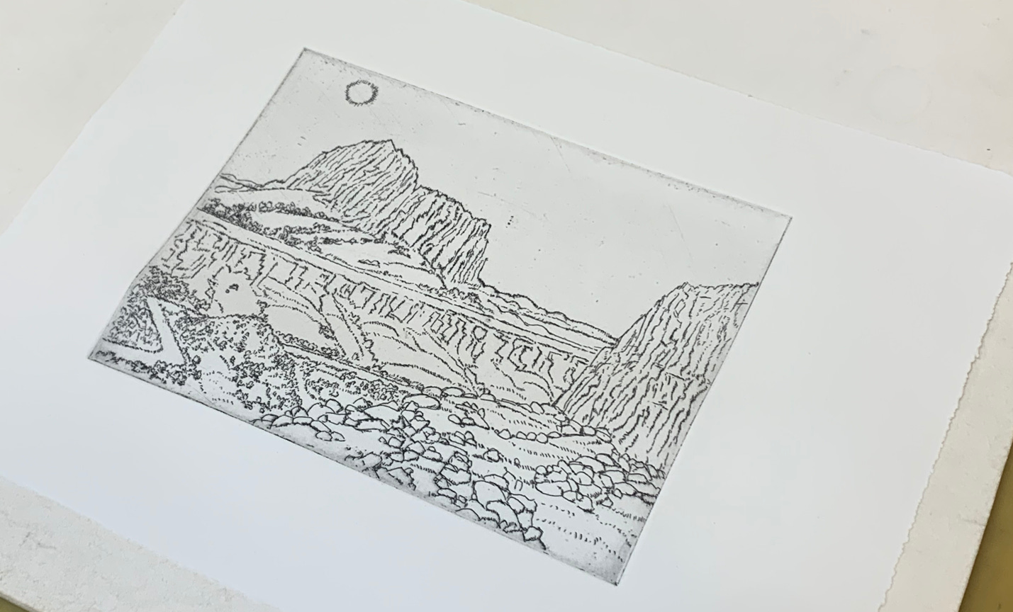 Using cardboard pincers to peel back the print from the plate, Cindi lays it out on the press-bed. The aquatint had left a good, even bite, but with an abrupt transition between a dark sky and the lighter horizon. I softened the troublesome border with emery cloth and steel wool which lessened, but did not solve the problem. Cindi then proposed a risky remedy. A creeping bite is achieved by dipping a plate prepped for aquatint into the acid at an angle, letting the acid areas of the plate submerged longer will receive a deeper bite, and print a deeper tone. The second plate was simpler, as it lacked similar gradations.