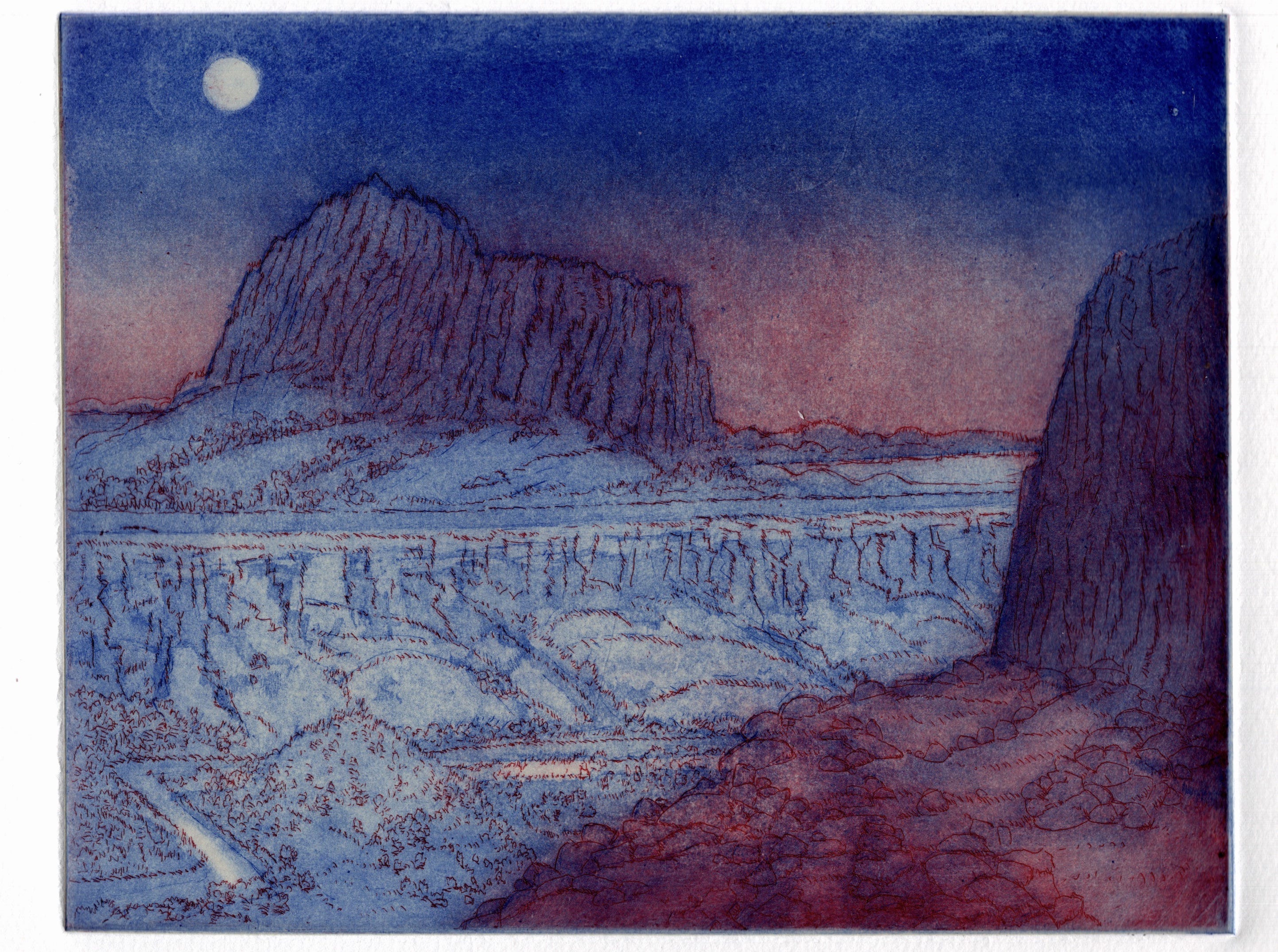 When Cindi printed the blue plate, and followed by the red plate, we could see that the creeping bite had worked. There were minor problems of alignment, but the challenge of achieving a smooth transition between the uppermost edge of the image and the horizon had been solved. I used a small spherical burnisher was to polish the plate in areas where aquatint borders strayed too far from the drawing.
