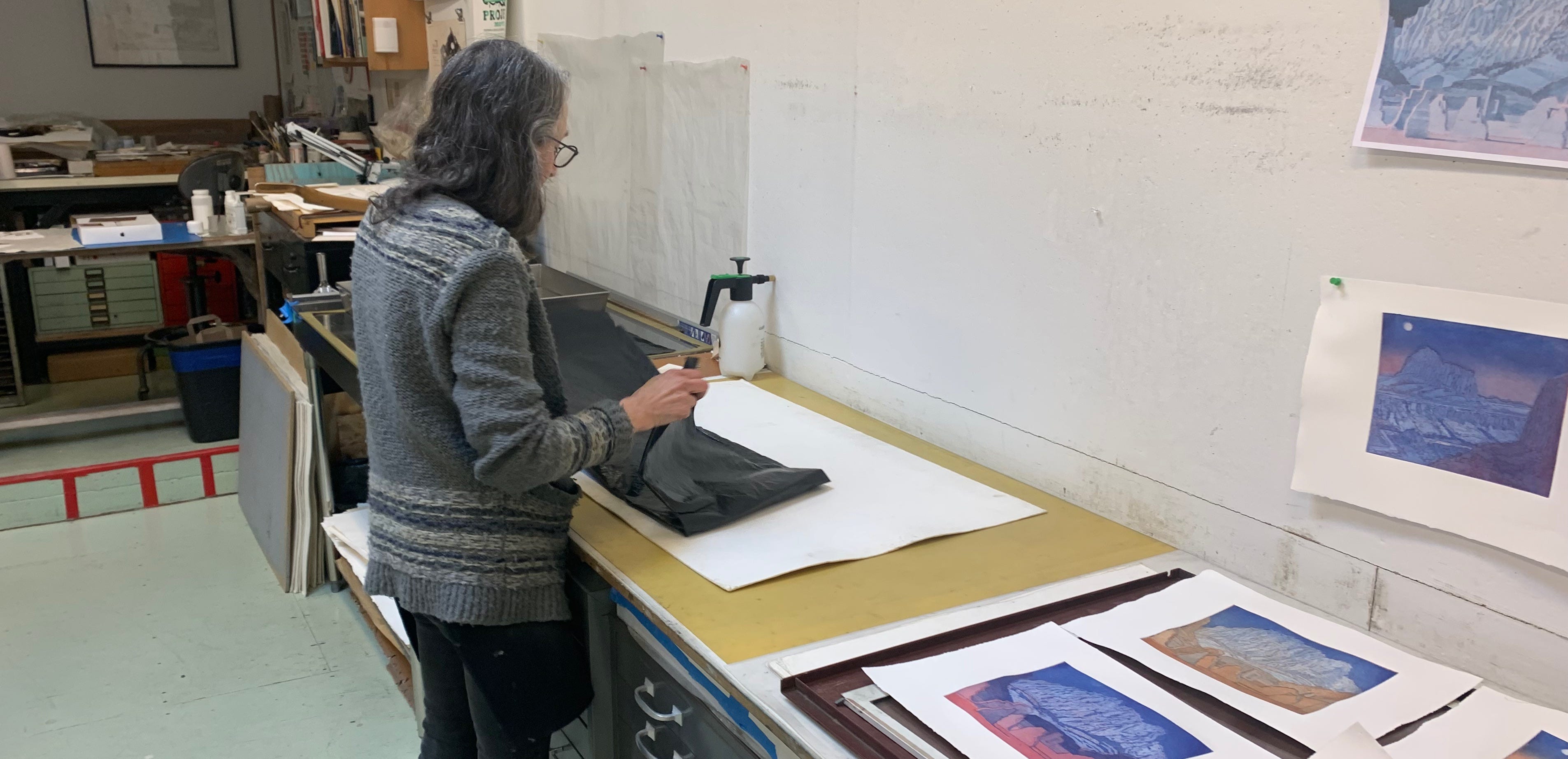 After dipping the heel of her hand in a shallow tray lined with talcum powder, Cindi brushes away the remaining residue with a light sweeping motion; taking care to keep chalky particles from entering the inked incisions. The plate is now carried to the press. Sheets of cotton laid paper produced by St. Cuthbert’s Mill in Somerset, England were prepared for printing first by soaking, then blotting, and finally resting in a waterproof nest of plastic sheets. Cindi gently grasps one of the sheets by its opposite corners, and lifts its onto the press