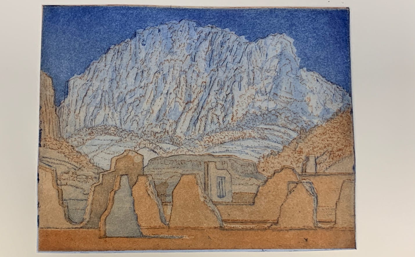 Mountain Elegy presented us with different difficulties. The intricacy of the image, combined with the compact density of overlapping forms needed to be broken up with subtle transitions in value. Being unable to keep building up aquatints we resorted to a technique known as spit bite, in which an acid solution is applied with a brush, directly onto the plate. Like the creeping-bite, it required a trust fall. One of the challenges is that where acid bites metal, a whitish foam appears, making it difficult to judge its effect. Rolling past four o’clock on Friday afternoon, we had three days behind us, and an hour to go before reaching the end of our session. Over the course of roughly 24 hours we had etched, scraped, abraded, burnished, inked, wiped, and printed two images with four plates. This was in addition to to the time I had spent developing the compositions as watercolors, transferring line-drawings of those images onto the plates, which I then inscribed. I commented to Cindi that it felt like we had just run the printmaking equivalent of a marathon—weeks of planning culminating in a burst of productivity. She had thought it a crazy plan, but felt satisfied with the results. The beauty of working collaboratively is that it leads us to places that we might never have found on our own.